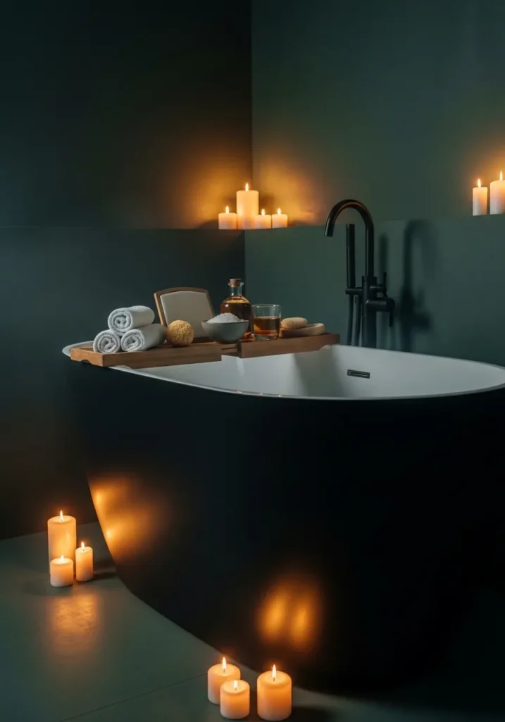 To elevate the mood, add candles, a wooden bath tray, and soft fabric accents nearby. This creates a ritual-like bathing experience that feels luxurious and deeply calming.