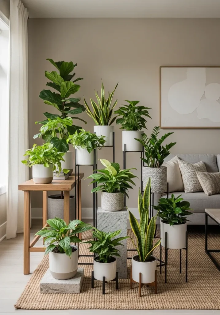 Plant stands are no longer basic—they now combine wood, metal, and stone to create layered visual interest. Elevating plants adds dimension and helps break up flat surfaces in a room.