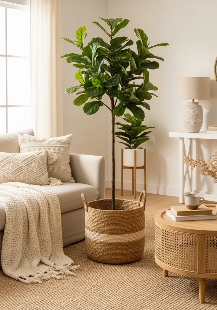 9. Indoor Tree in Woven Basket for Soft Contrast
