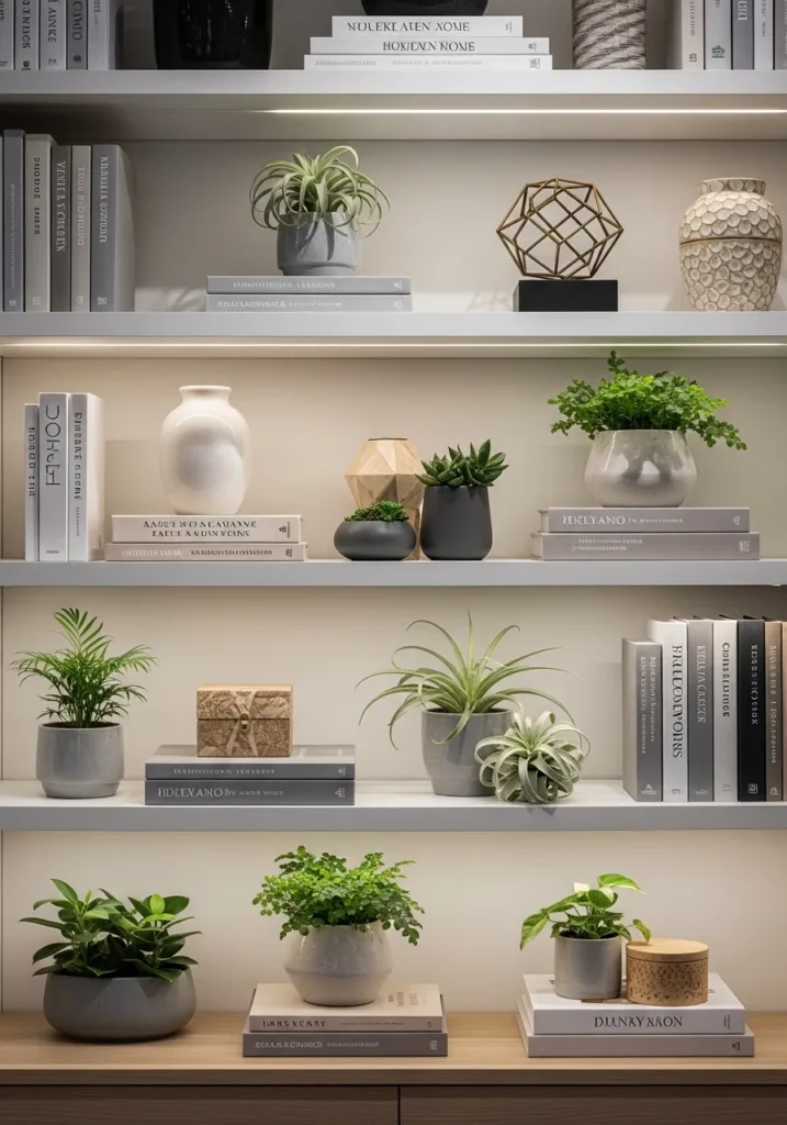 Shelves are being styled with mini plant arrangements combined with books and decor objects. The key is to keep it balanced—avoid overcrowding and focus on clean spacing.
