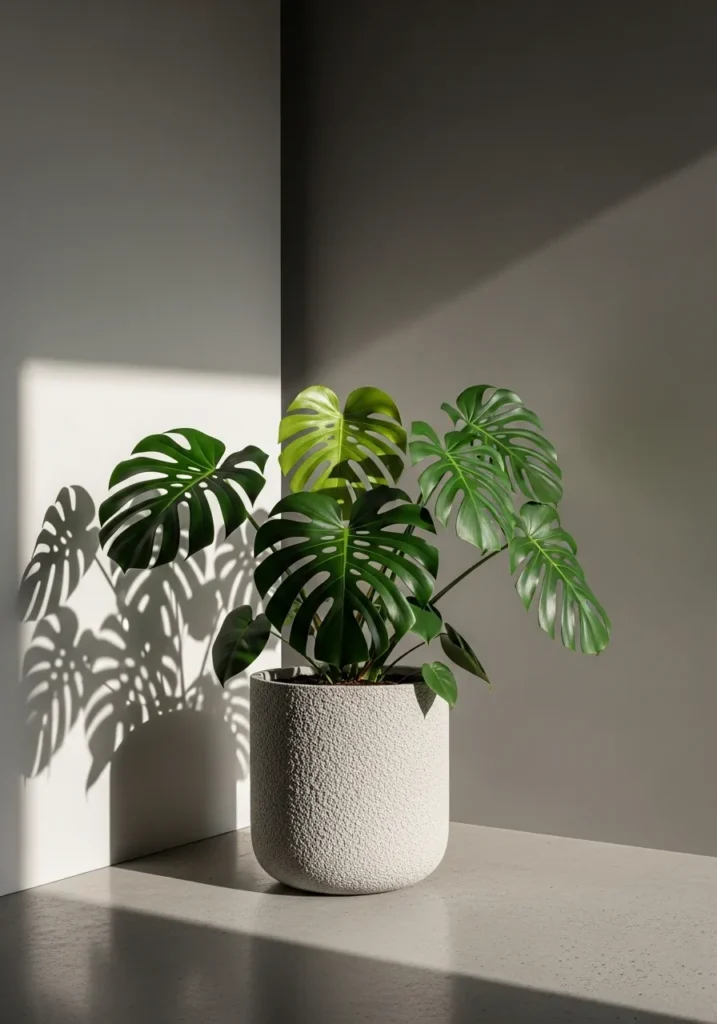 The monstera remains a favorite, but in 2026 it’s styled with heavier, stone-like planters for a more architectural feel. Choose a raw concrete or textured stone vessel to complement the bold split leaves and give the setup a grounded presence.