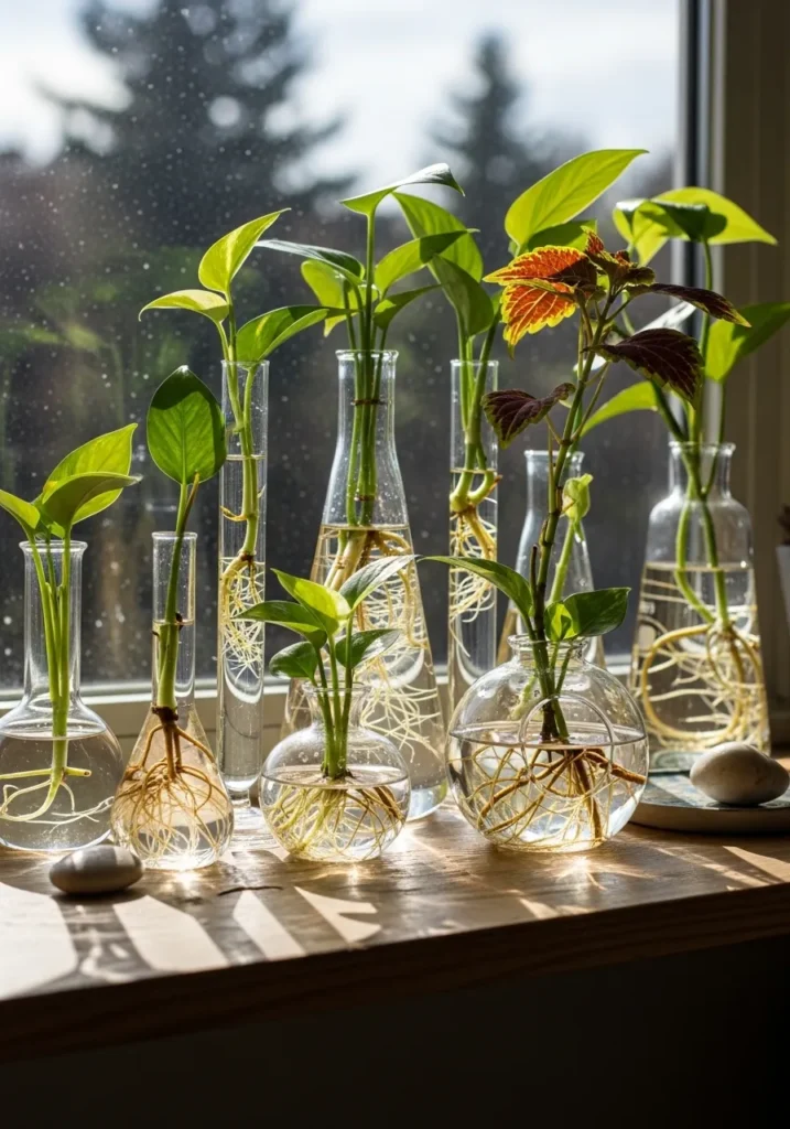 Water propagation is being turned into decor by using clear glass vessels that showcase roots as part of the design. This adds a scientific, almost artistic element to plant styling while keeping things light and transparent.