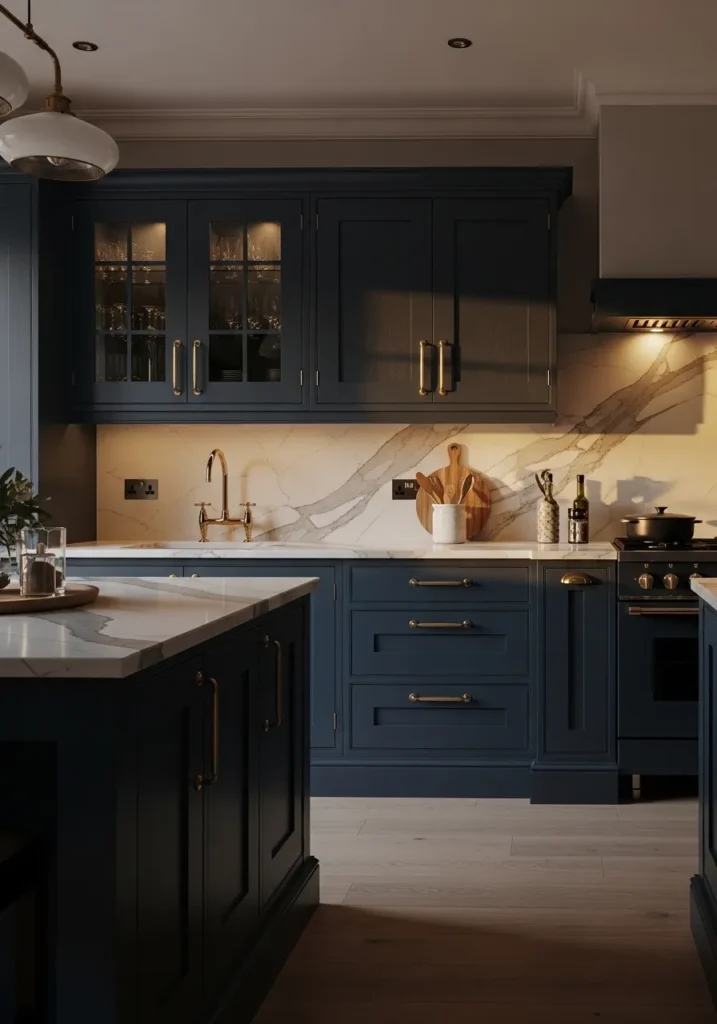 Midnight blue kitchens create a rich, immersive atmosphere that feels dramatic and cozy at the same time. This deep tone works especially well in open-plan homes where lighting can highlight its richness.
