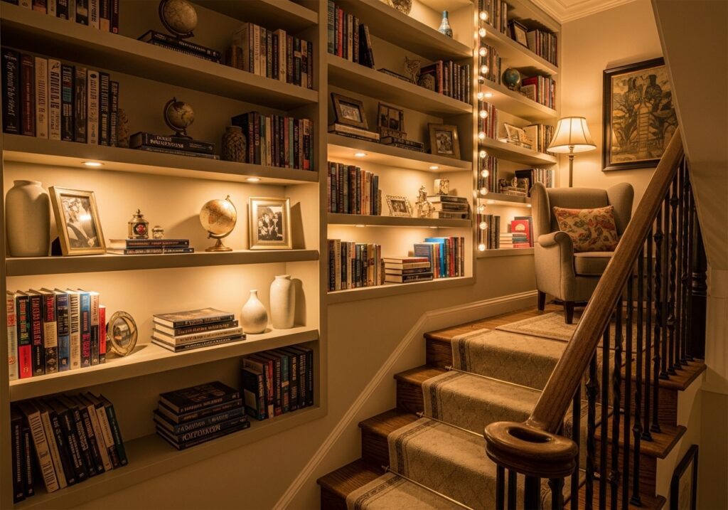 Install built-in bookshelves along the stairwell wall to create a cozy, library-inspired look. This idea maximizes vertical space while offering practical storage for books and décor.