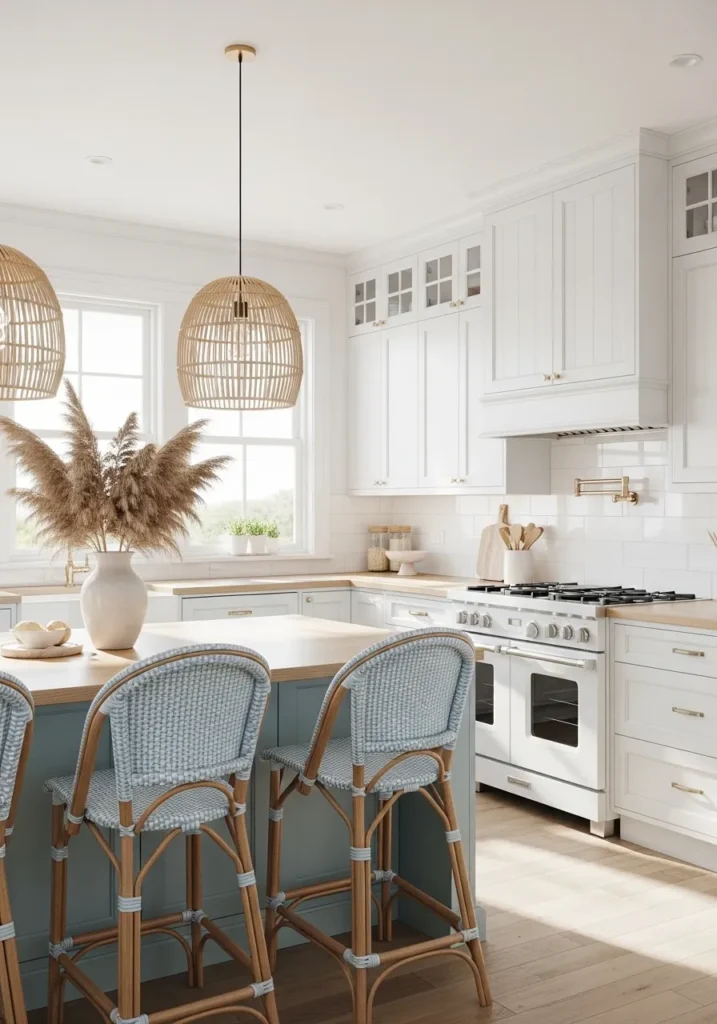 This coastal-inspired design uses soft blues and natural textures with white Shaker cabinets. It feels fresh and relaxing.