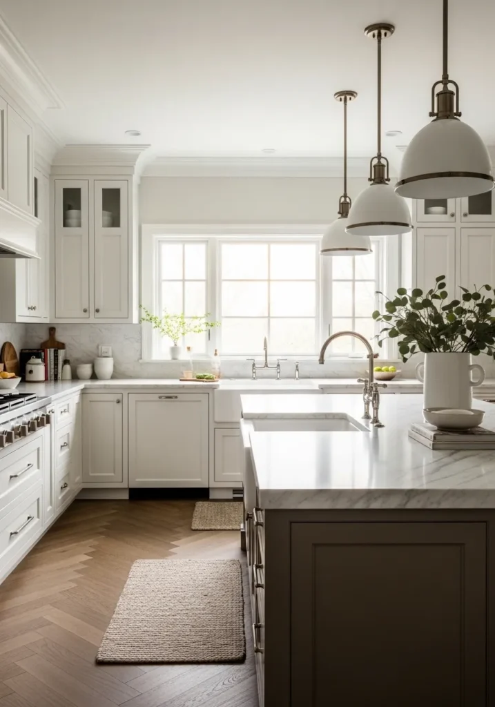 This style works especially well with marble countertops and soft lighting. It creates a timeless high-end aesthetic.