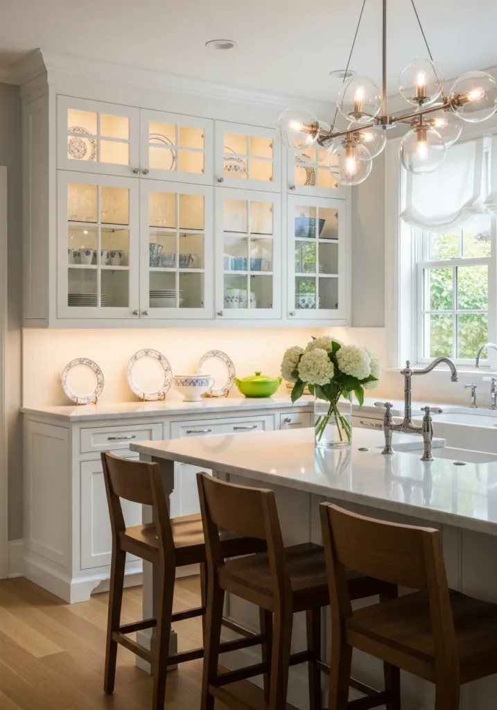 - 13 13. White Shaker with Glass-Front Cabinets