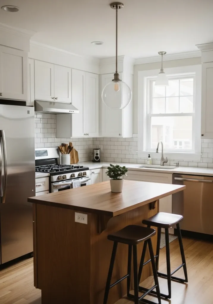 The oak island or shelving breaks the monotony of white cabinetry and introduces organic texture. This design is trending in 2026 for its balance between modern simplicity and natural comfort.