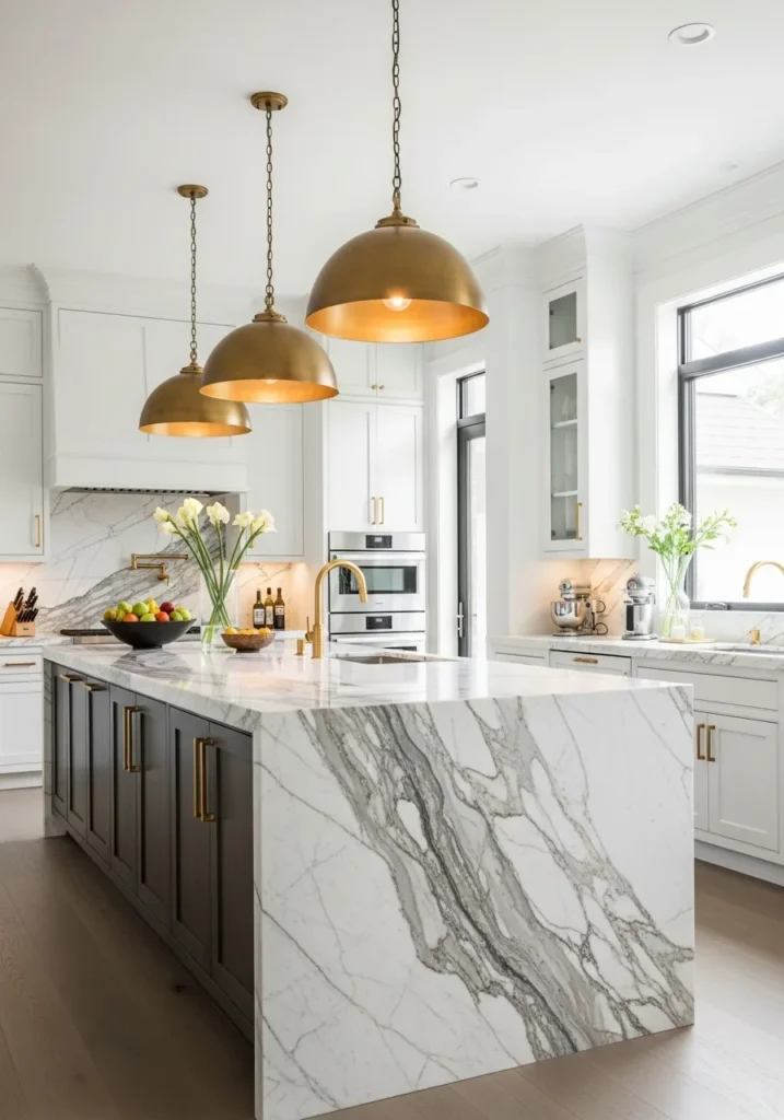 - 9 9. White Shaker with Marble Waterfall Island